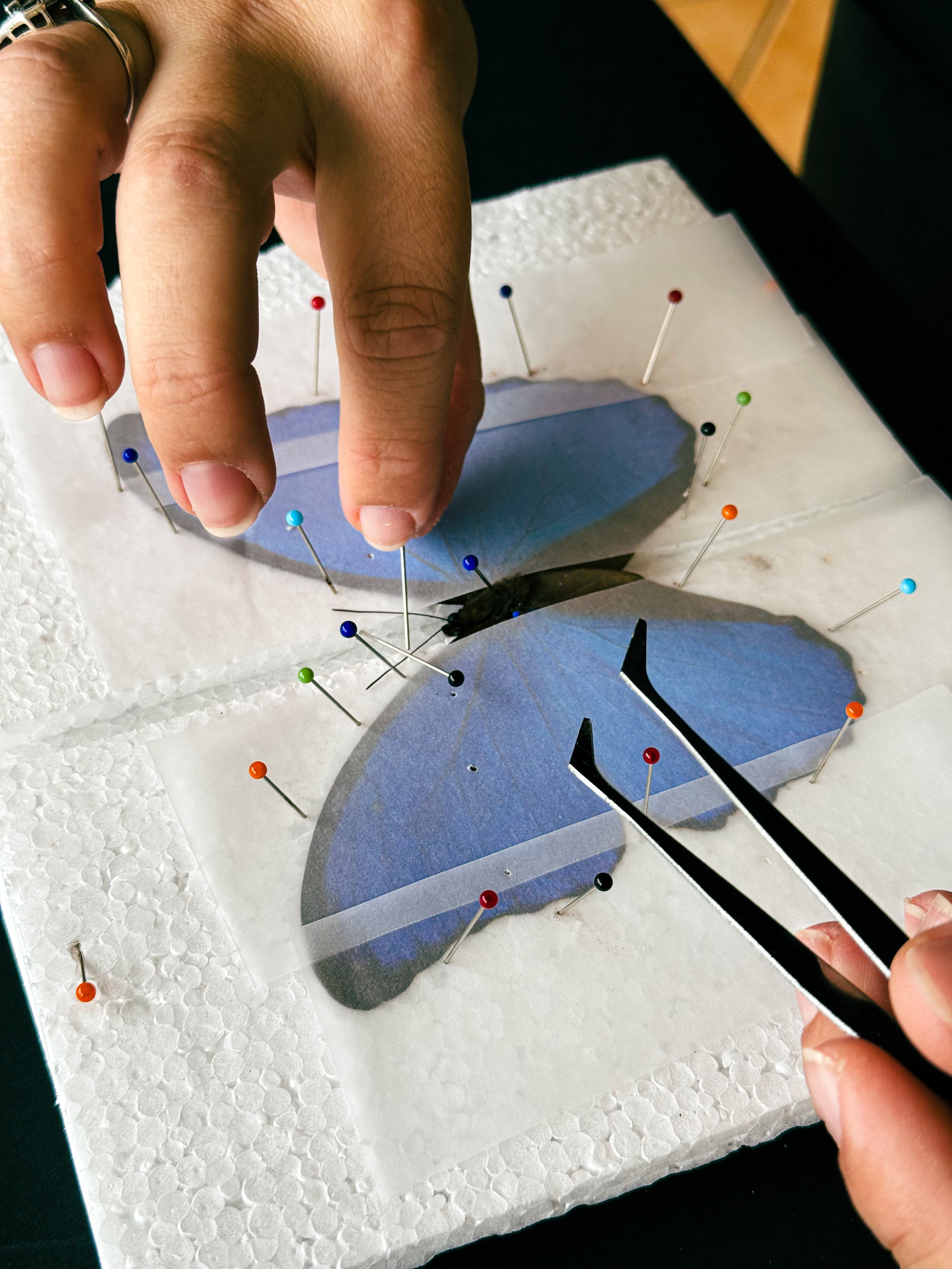 Des créations artisanales mêlant papillons naturalisés et miroirs gravés à la main.