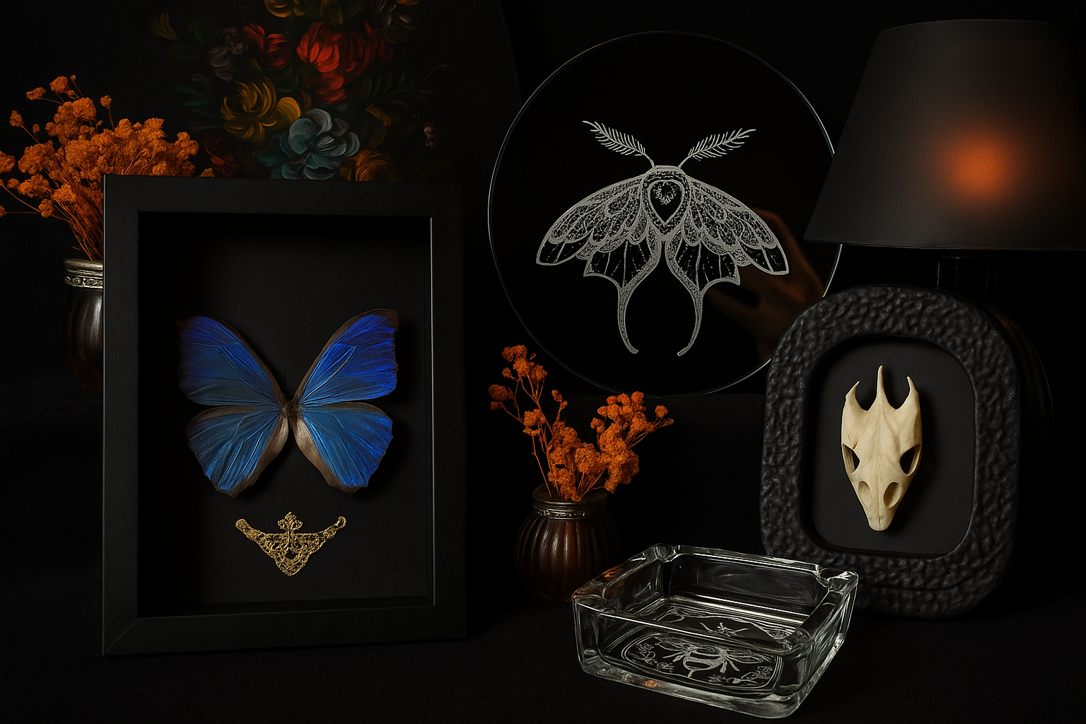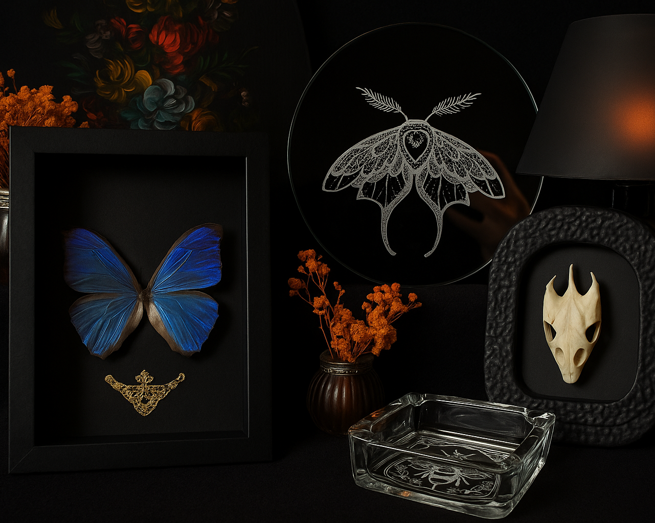 Des créations artisanales mêlant papillons naturalisés et miroirs gravés à la main.